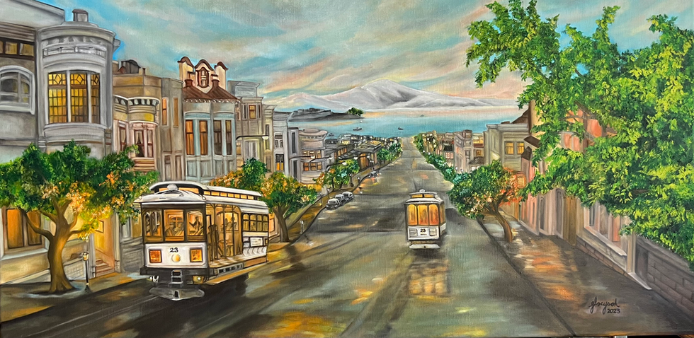 Took me about 3 work weeks to finish this artwork. It was a challenging piece, the details and depth required quite a bit of time but I thoroughly enjoyed making the canvas come alive! Hyde Street in San Francisco … as per the memory of my client.
